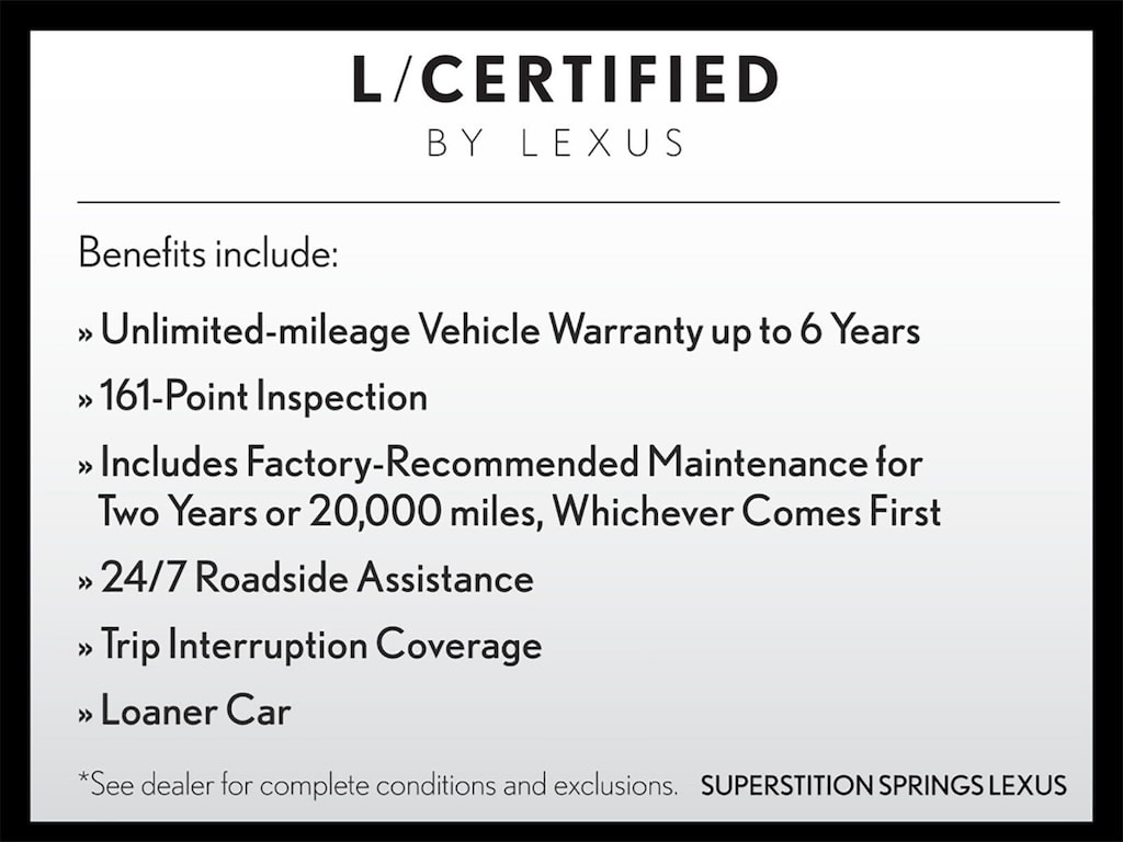 * CERTIFIED WARRANTY: Comprehensive Inspection, Unlimited-mileage warranty up to 6 years. Balance of new car warranty (4 Year/50K Miles) plus 2 Year/Unlimited-mileage L/Certified warranty. SERVICE MAINTENANCE: Complimentary Maintenance Plan covering the first four basic factory-scheduled maintenance services for 2 years or 20,000 miles